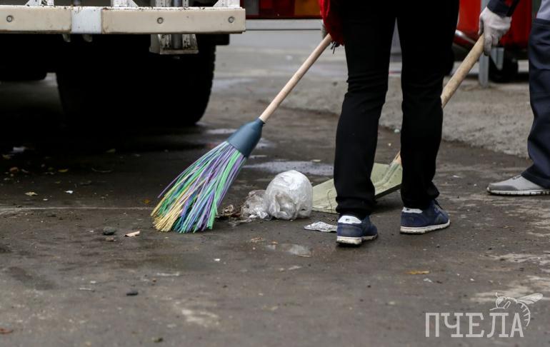 После погрузки мусора в машины рабочие убирают оставшиеся отходы