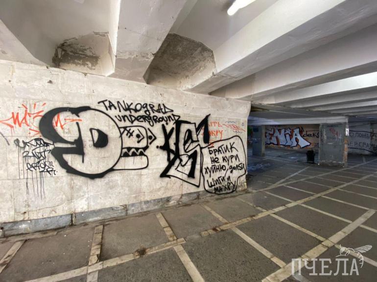 Уличные художники разукрасили подземный переход на площади Революции нецензурными надписями и неаккуратными рисунками. Сделали это после того, как мэр города Наталья Котова анонсировала роспись граффити одного из переходов Челябинска.