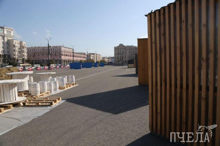 На площади Революции начали монтировать киоски, туда привезли сено