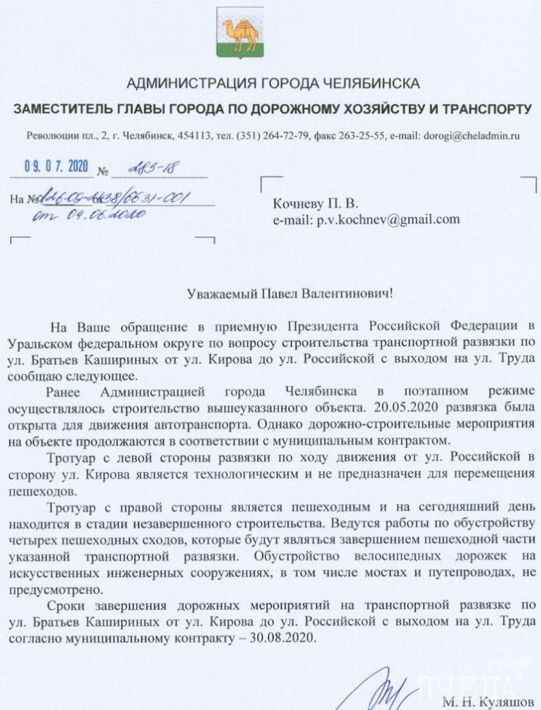 Челябинцы поделились письмом чиновника, отвечающего за дороги в городе, — заместителя главы города по дорожному хозяйству и транспорту Максима Куляшова, который вступил в должность в начале года. Куляшов отправил этот ответ на обращение челябинцев в приёмную полпреда президента по Уральскому федеральному округу.