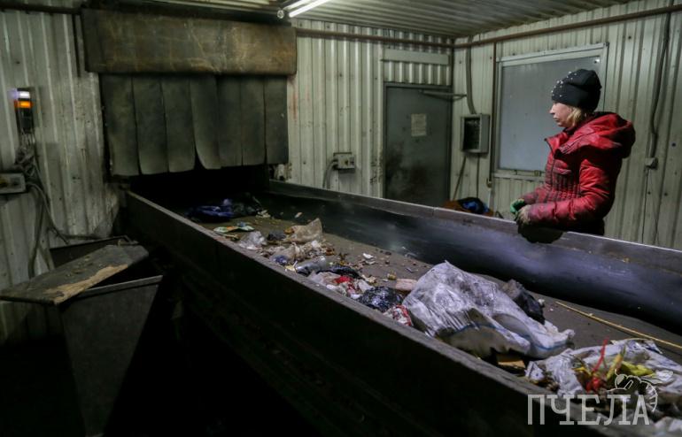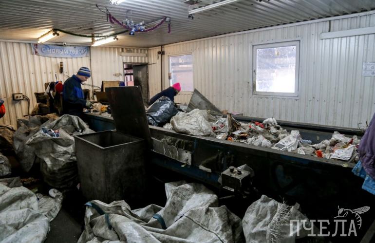 Вдоль ленты стоят несколько работников, каждый из которых отвечает за сбор каких-либо фракций вторсырья. Отбирают бумагу, отдельно белые и цветные пластиковые бутылки (ПЭТ — полиэтилентерефталат), бытовой пластик, жесть, алюминий и полиэтилен. Что-то складывают в большие сетки, что-то скидывают вниз через металлические контейнеры с желобами. И так — на протяжении 12 часов с часовым перерывом на обед. Удивляет, что работают без масок. Но, возможно, запах кажется жутким только с непривычки. Зарплата за это — минимальный размер оплаты труда (МРОТ) и премии за выполнение объёмов.
