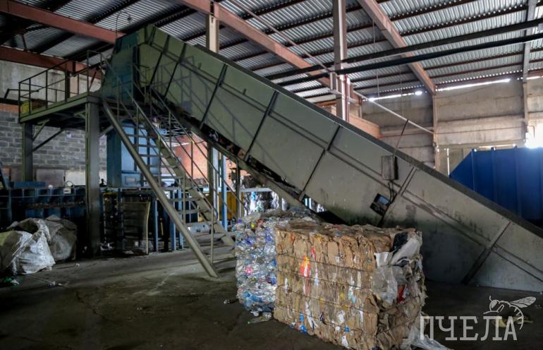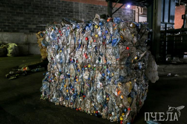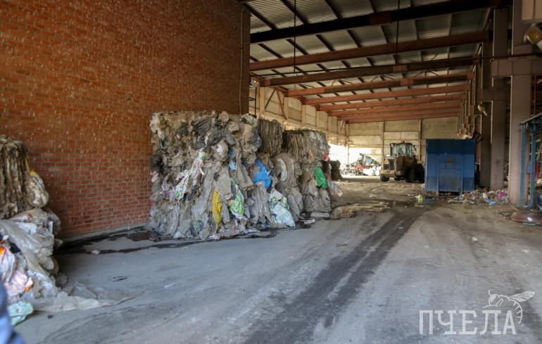 Затем отобранный мусор попадает на мощный пресс — и становится готовым к отгрузке на переработку вторсырьём