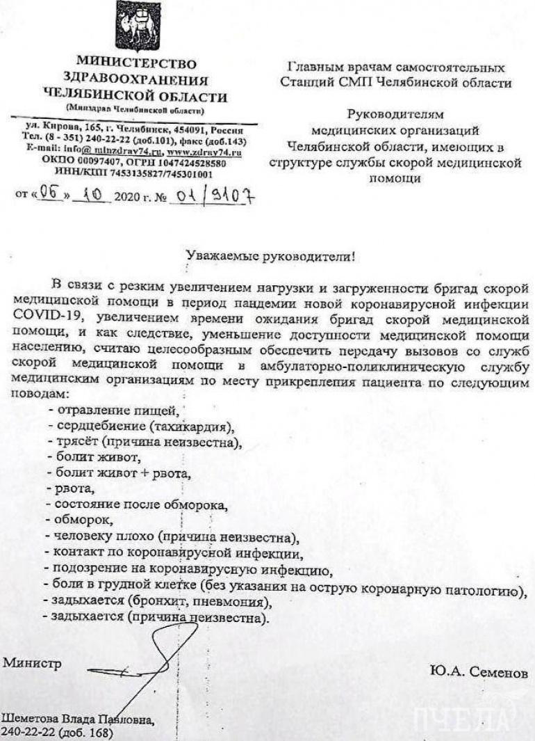 Документ, сообщающий о том, что скорая помощь перестанет выезжать по вызовам, если речь о симптомах заболеваний, не представляющих угрозы для жизни, министр здравоохранения области подписал 6 октября. Речь идёт о сердцебиении, пищевом отравлении, болях в животе, рвоте, трудностях с дыханием. В стоп-лист попали и такие сообщения от пациентов, как контакт по коронавирусной инфекции и подозрение на коронавирусную инфекцию. С полным списком можно ознакомиться в документе.