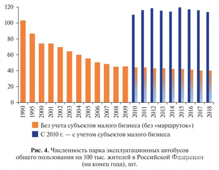 Как видно из инфографики, парк больших автобусов с 1990 года регулярно сокращался, зато численность маршруток с 2010 года, когда их начал считать Росстат, и до 2018 года оставалась стабильной.