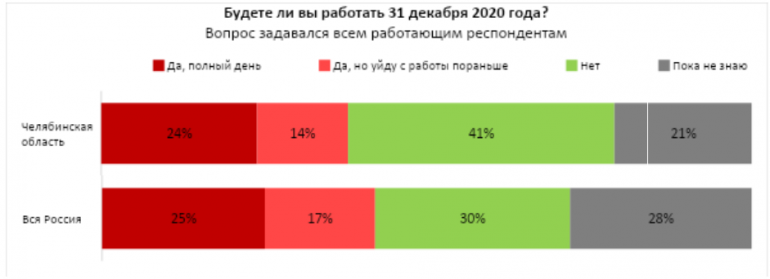 41% южноуральцев уверенно заявили, что трудиться в последний день года не будут. Выше этот показатель оказался только в Белгородской и Пензенской областях, где отдыхать 31 декабря собираются 43% и 47% жителей.