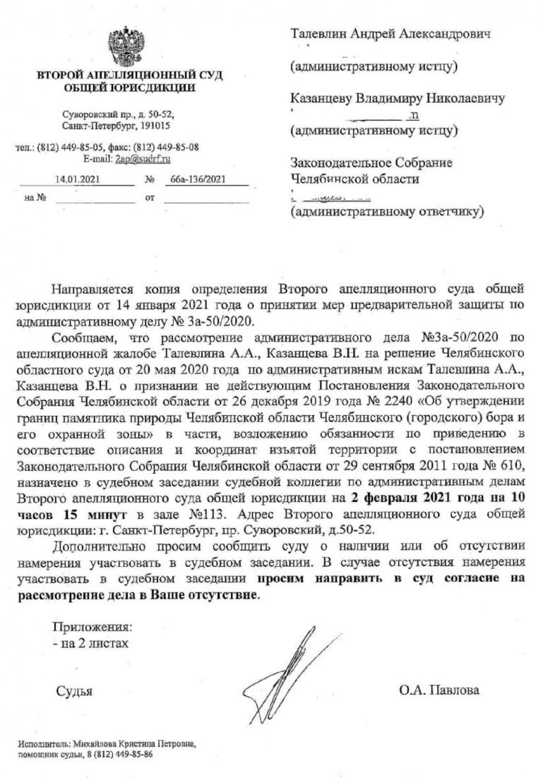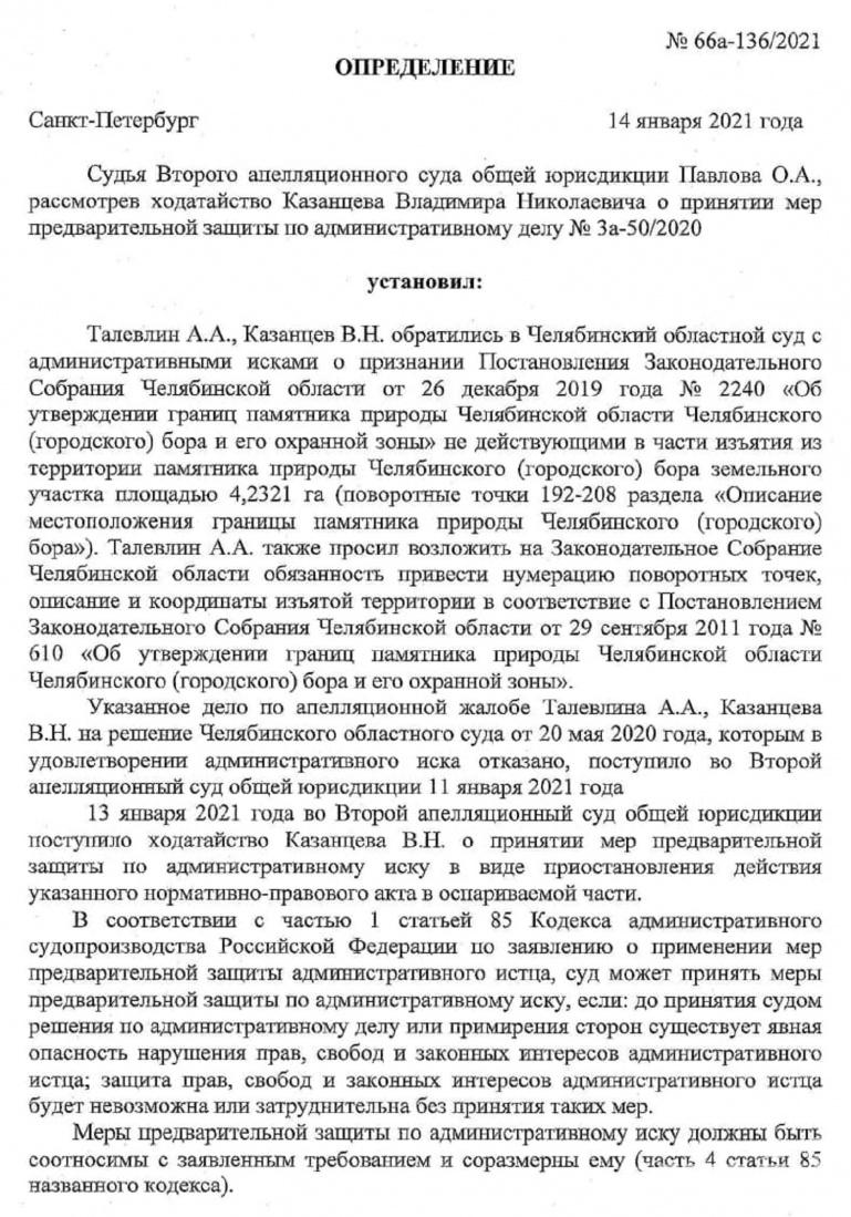 Второй апелляционный суд (Санкт-Петербург) запретил применять постановление Заксобрания области об изменении границ Челябинского городского бора. Эти меры будут действовать до нового рассмотрения в суде спора о выделении участка бора под строительство нового хирургического комплекса детской областной больницы. Ходатайство правозащитника Владимира Казанцева было удовлетворено накануне, 14 января.
