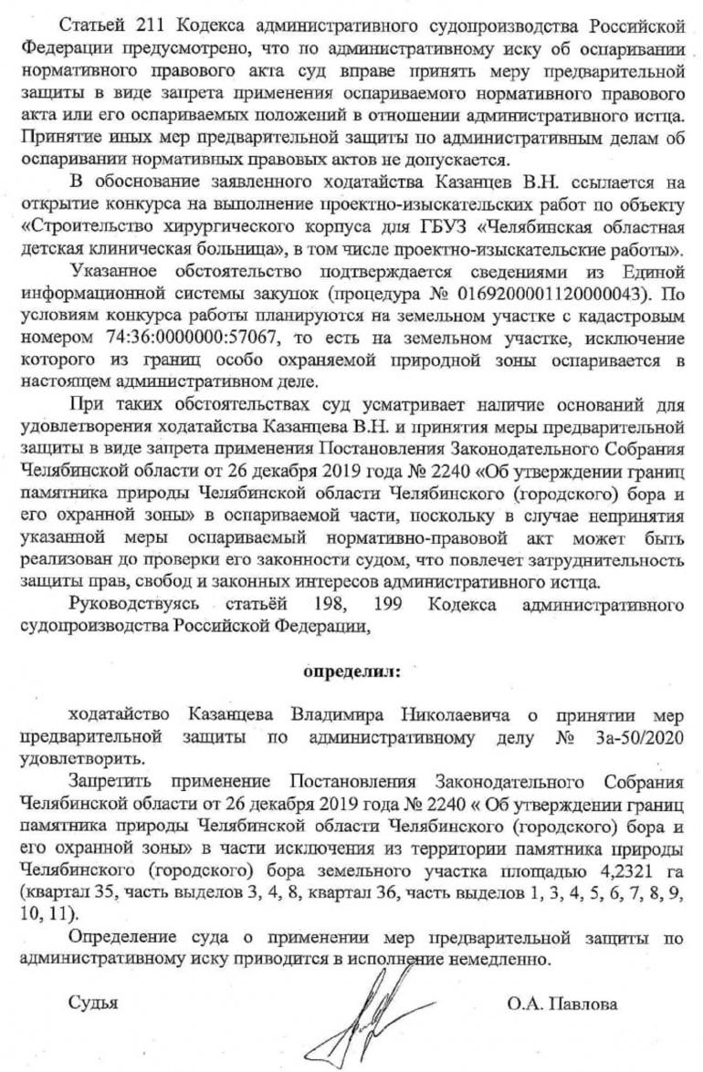 20 мая Челябинский областной суд признал законным постановление Заксобрания области от 26 декабря 2019 года о выведении из границ городского бора участка площадью 4,2 га под строительство хирургического корпуса ЧОДКБ. Этим актом в границы памятника природы также были включены территории, расположенные в урочище «Монахи» и в пойме реки Миасс между мостом по улице Худякова и плотиной пруда Коммунар. Иск подавали лидер региональной экологической фракции «Зелёная Россия» Андрей Талевлин и директор общественной организации «Экологический консалтинг» Владимир Казанцев. А 26 мая депутаты гордумы одобрили строительство корпуса. Губернатор Алексей Текслер 19 июня высказался о строительстве этого детского хирургического корпуса. Позже, 16 сентября, второй апелляционный суд (Санкт-Петербург) отменил решение Челябинского областного суда об изменении границ городского бора для строительства центра детской хирургии. В Минэкологии области заявили, что продолжат отстаивать свою позицию в суде.
