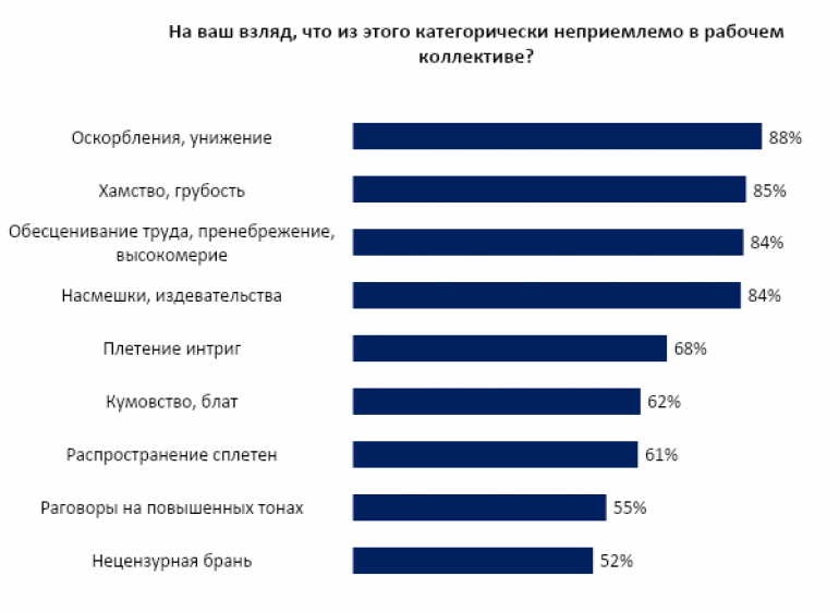 Среди проявлений неподобающего поведения и абьюза больше всего отторжение у работодателей вызывают оскорбления и унижение (88%), хамство и грубость (85%), обесценивание труда (84%), насмешки и издевательства (84%).