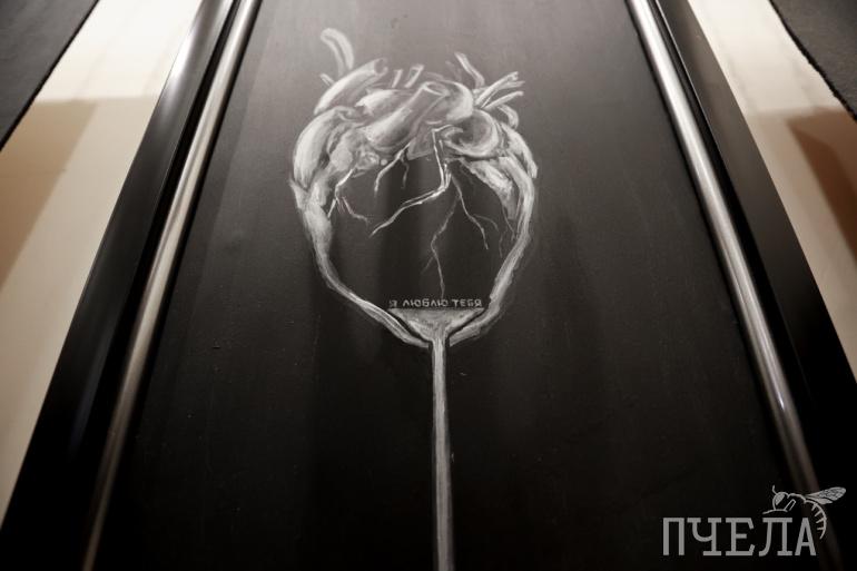 — Это сердце, наполненное любовью, — рассказывает художница об одной из картин. — И кому-то мы готовы отдать любовь до последней капли. На то, чтобы попробовать с помощью изобразительного искусства донести эту мысль, меня вдохновило живое выступление Скриптонита, а точнее, конкретная песня «Положение».
