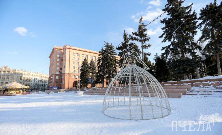 До конца февраля ледовый городок на площади Революции будет работать в обновлённом формате: ледовые фигуры там заменили световыми композициями и аттракционами.