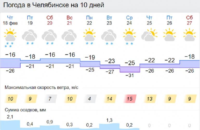 В ночь на субботу, 20 февраля, в регионе будет немного теплее — до -27 градусов, в ночь на воскресенье — уже до -31. Днём воздух будет прогреваться до -13…-20 градусов. В Челябинске по ночам будет до -26, днём — до -14…-17 градусов.