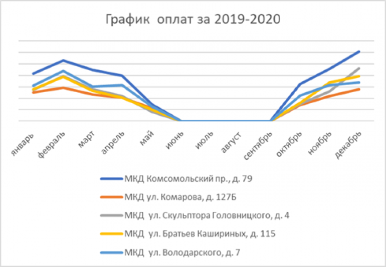 Январь и февраль — традиционно самые холодные месяцы в году. Для наглядности компания проанализировала оплаты за 2019–2020 год в разные месяцы года по пяти различным адресам в Челябинске. Графики показывают: чем ниже температура, тем выше потребление тепла и соответственно оплата за него.