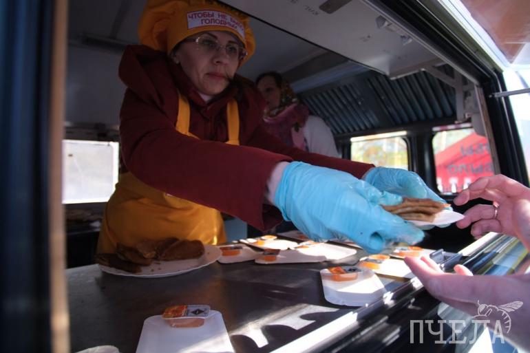Благотворительный фонд «Пища жизни» бесплатно угощал горожан блинами, чаем и супом. Активисты заготовили более двух тысяч порций.