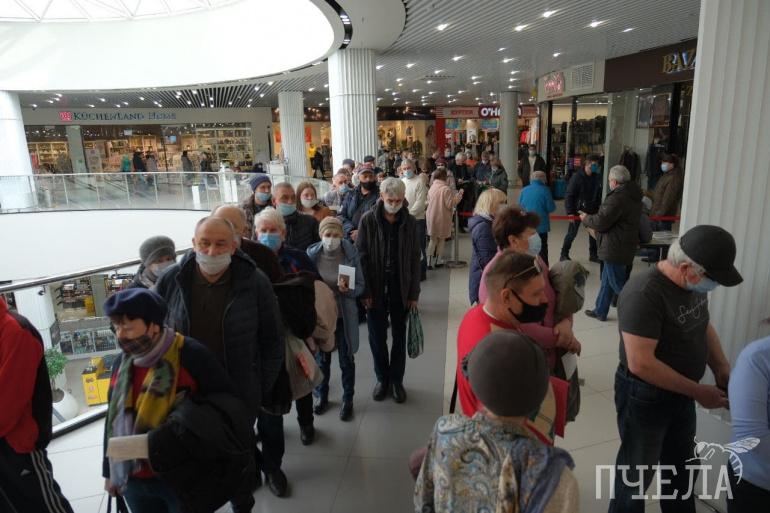 К прививочной кампании присоединился ещё один ТРК. В «Космосе» сегодня днём, 27 марта, выстроились очереди из десятков человек.