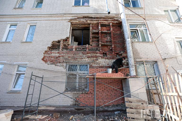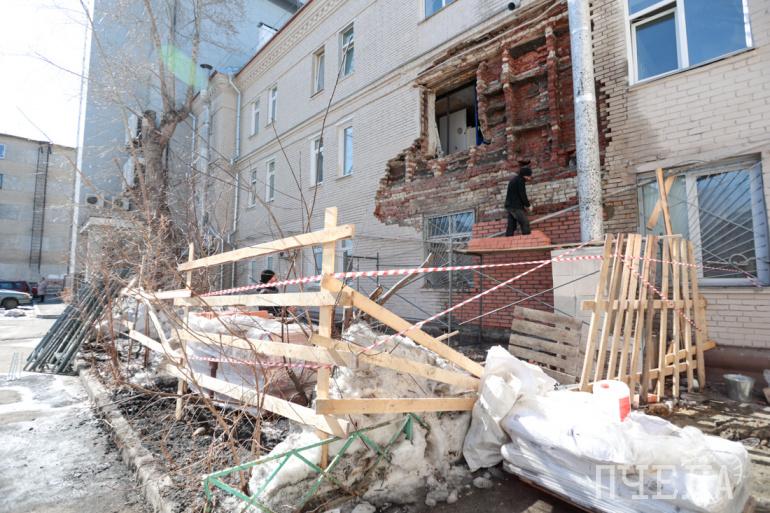 Работы, по данным администрации, ведут специалисты ООО УК «Ремжилзаказчик Центрального района». Они уже установили подпорки в виде строительных домкратов, а также восстановили кирпичную кладку первого этажа.