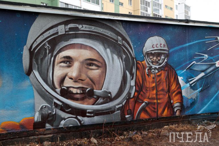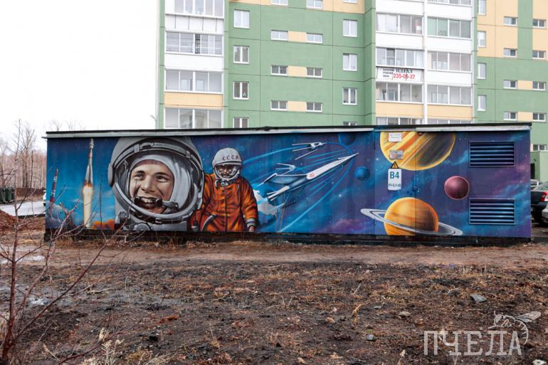 Однако есть всё же один объект, целесообразность которого не вызывает вопросов. Это недавно появившееся на одной из трансформаторных будок в микрорайоне «Парковый-2» граффити. Его автор — Тимур «Бразил» Абдуллаев. Работу, которую он выполнял с коллегой Дмитрием Прозоровским, молодой человек посвятил юбилею полёта Юрия Гагарина в космос.