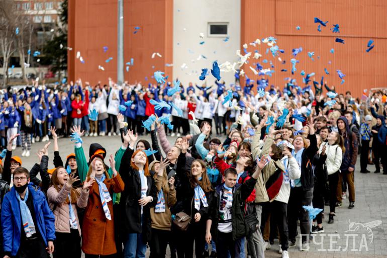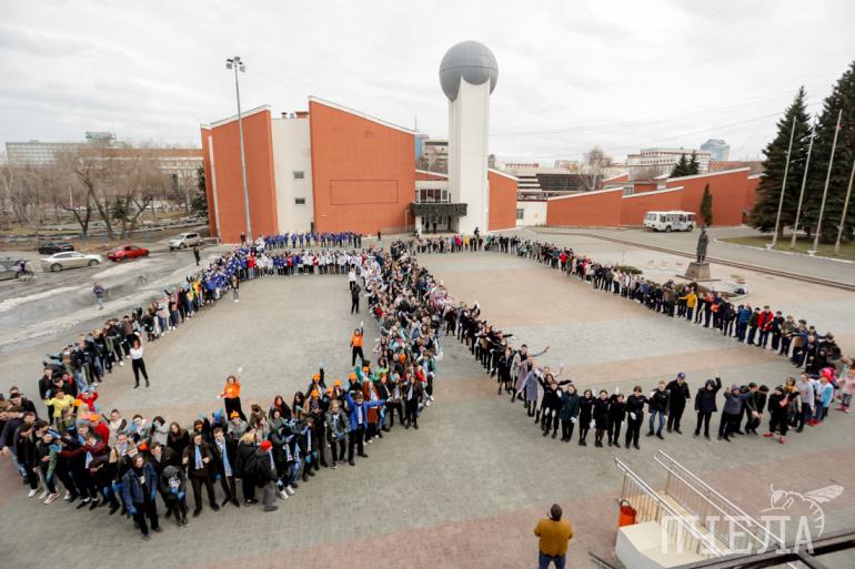 Мероприятие под названием «Восток-1» прошло на площадке возле дворца пионеров и школьников имени Крупской. Для начала всех участников флешмоба выстроили в цифру «60». Она была выбрана не случайно — ровно 60 лет назад, 12 апреля, Юрий Гагарин открыл для всего мира космос.