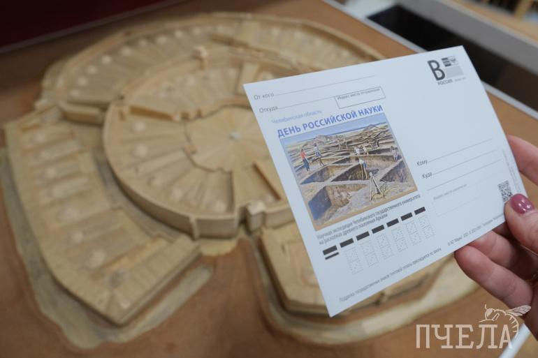 Почтовую карточку, посвящённую раскопкам укреплённого поселения бронзового века Аркаим, выпустили ко Дню российской науки. Фото для неё когда-то сделали сотрудники университета на раскопках древнего памятника. Снимок для АО «Марка» нашёл и предоставил архив учебно-научного центра изучения проблем природы и человека ЧелГУ.