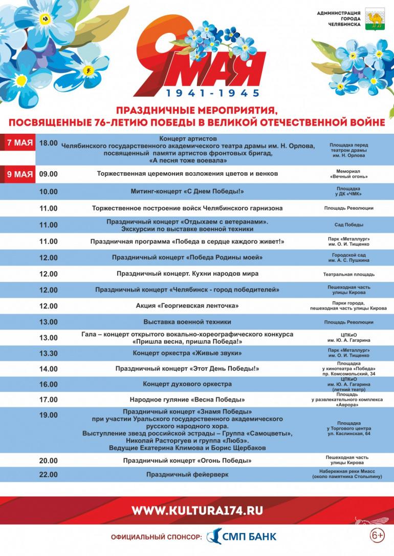 Праздничные мероприятия в честь 76-летия со Дня Победы в Великой Отечественной войне в Челябинске стартуют 7 мая. Об этом в пятницу, 23 апреля, сообщили в пресс-службе администрации города, представив афишу праздничных мероприятий.