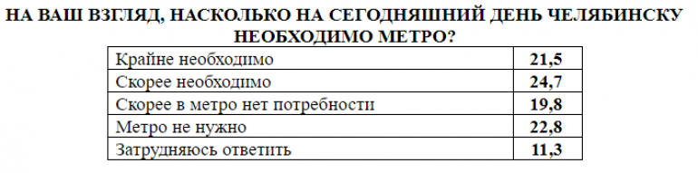Твёрдо уверены в том, что городу хватает имеющегося транспорта, респонденты от 45 до 59 лет, а также малообеспеченные по субъективным оценкам горожане. Затруднились ответить на вопрос неработающие пенсионеры. Опросы показывают, что количество желающих увидеть метро в Челябинске с годами всё же сокращается.