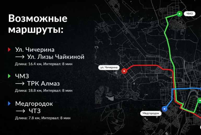 Сейчас на 20% готова станция «Торговый центр», на 45% — станция «Комсомольская площадь». Планируется сделать ещё две подземные пересадочные станции в районе пересечения улицы Елькина и проспекта Ленина. Зелёная подземная ветка свяжет ЧМЗ с Ленинским районом. Новая наземная линия свяжет Ленинский район с центром города напрямую. Конечная станция метротрамвая будет расположена в районе ТРЦ «Алмаз». Пассажиропоток с ЧТЗ и Чурилово будет также связан с новым метротрамваем.