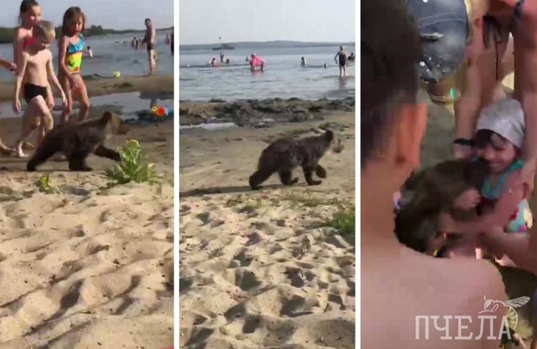 В выходные в Челябинской области медвежонка искупали на полном людей пляже.