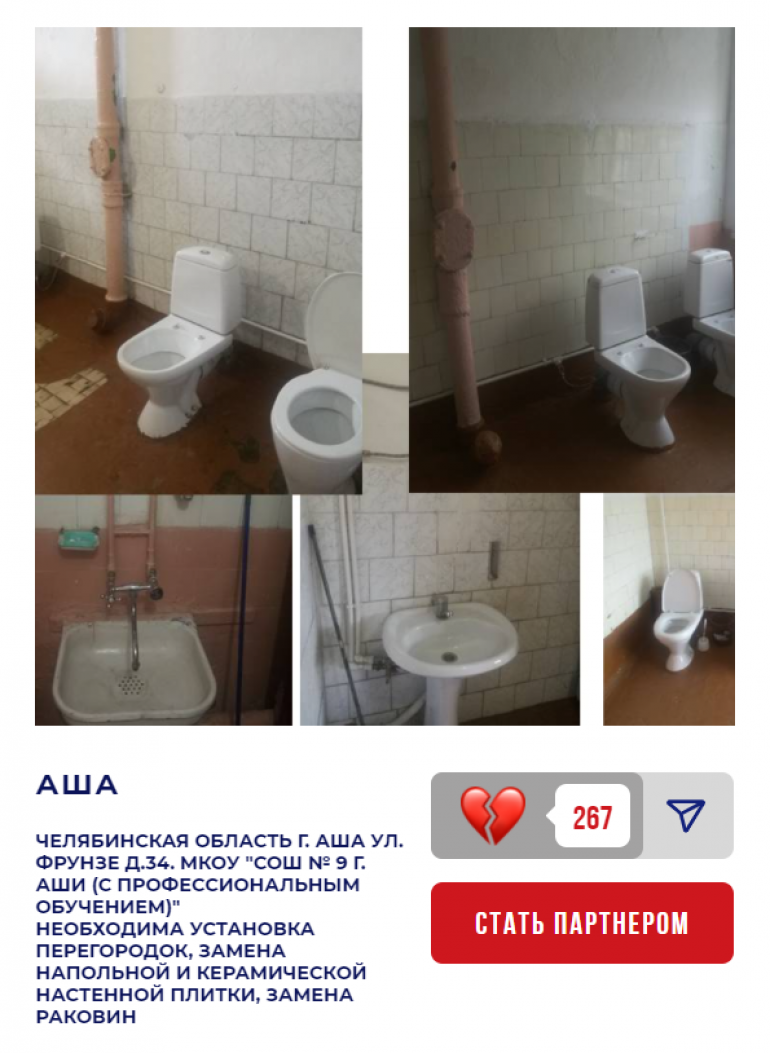 Первые пять школ — из Ашинского района. На данный момент лидирует среди них МКОУ «СОШ № 9 г. Аши (с профессиональным обучением)» — 267 баллов. Согласно сопроводительному сообщению, в местном туалете не хватает перегородок, а напольную и настенную плитки, а также раковины давно пора заменить.