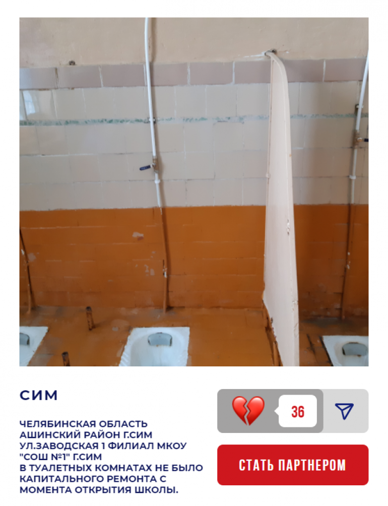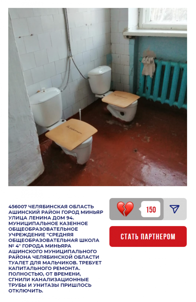 Ещё один участник — МКОУ «СОШ № 4» в Миньяре. Местный туалет для мальчиков, который выглядит ужасно и давно «просит» капитального ремонта, набрал уже 150 баллов. Причём, если судить по описанию, заменить там есть что — канализационные трубы полностью сгнили, поэтому унитазы пришлось отключить.