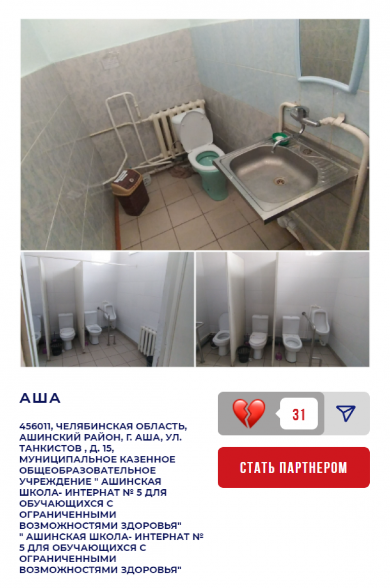 «Ашинская школа-интернат № 5 для обучающихся с ограниченными возможностями здоровья» на данный момент набрала всего 31 балл. Там, кстати, всё не так плохо — чистые стены, не убитые временем унитазы, есть даже писсуар. Но небольшой ремонт всё же не повредил бы.