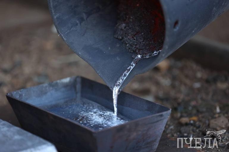Чистый раскалённый металл заливают в формы