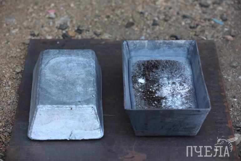 Остывает алюминий быстро — через 15 минут формы переворачивают, получаются слитки. После полного остывания их взвешивают и маркируют