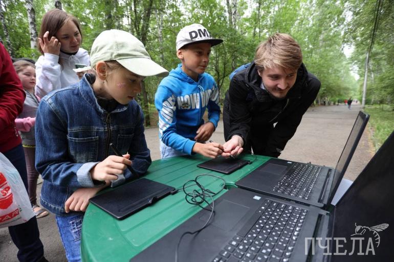 Затем корреспонденты «Пчелы» отправились в парк «Металлург» имени Олега Тищенко. Там в 11 часов на площадке у фонтана стартовали мастер-классы от центра технического творчества Челябинской области. Самое большое скопление детей было у зоны с очками виртуальной реальности — похоже ребят больше привлекают современные технологии и игры.