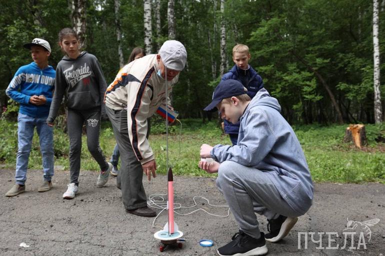 — Перед вами представители авиа- и ракетомоделирования, — представил Александр Щуров. — Сегодня мне помогает мой ученик Никита, участник различных соревнований по ракетомоделированию. Мы готовим систему спасения ракеты. Когда амортизатор в виде резинки растягивается, парашют раскрывается, и ракета медленно падает на землю. Чтобы парашют точно раскрылся, нужно посыпать его внутреннюю сторону крахмалом. Когда всё готово, можно запускать ракету. Запуск мы осуществим с помощью порохового двигателя, который вставляется в ракету. По мерам безопасности при запуске ракеты близко стоять не рекомендуется.