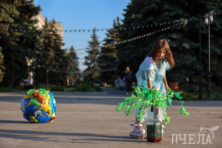 Поддержать экоперформанс и юных артистов пришла блогер Соня Гудим. Девушка сыграла роль ангела, который спасает мир.