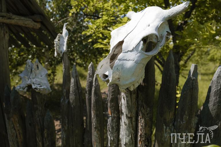 — Черепа на заборе отпугивают злых духов, — поясняет Николай. — Для деревни очень важно иметь домашний скот, но, представьте, что люди утром просыпаются, кто корову подоить, кто поросёнка покормить, а на улице вся скотина дохлая валяется. Виной этому страшный, злой дух, который называют «Коровья смерть» — чудище в виде коровы. Это страшилище смертельно опасное, но очень глупое. Видит на воротах черепа и думает, что, наверное, в этой деревне вся скотина уже передохла, и идёт другую деревню.