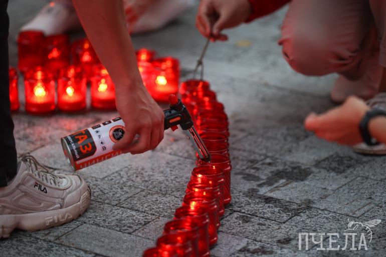 Затем активисты расставили у памятника лампадки и зажгли в них огоньки.