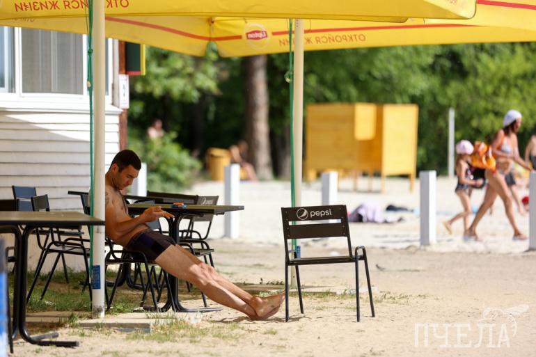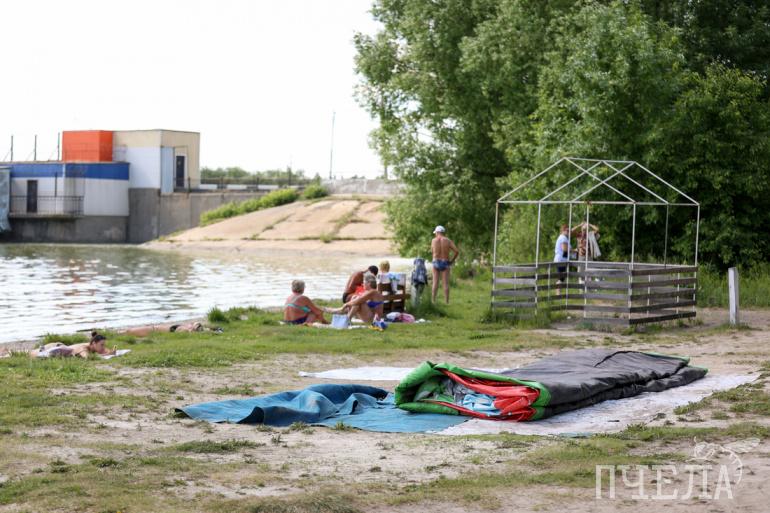 В начале июня на площадку завезли урны и скамейки. Вдоль береговой линии уже появились деревянные зонтики, которые будут защищать отдыхающих от палящего солнца, установили шезлонги. Батут в будний день лежал сдутым, скорее всего, его надувают в выходные.