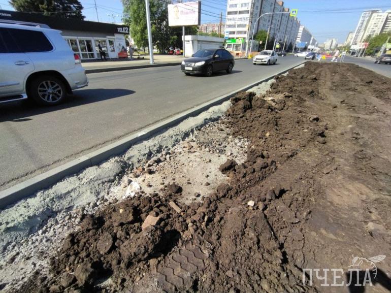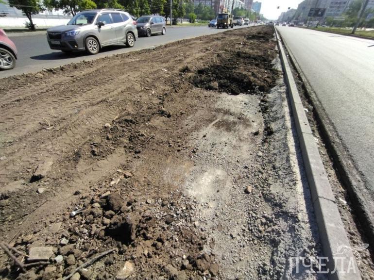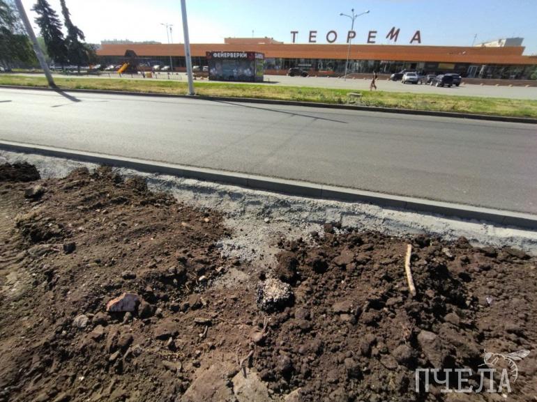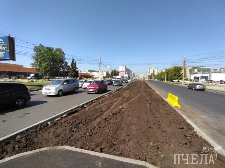 Ранее в мэрии рассказывали о том, как будет выглядеть полоса зеленых насаждений. На отфрезерованную поверхность собирались насыпать 40 см грунта. Этой глубины, по мнению чиновников, достаточно для укладки газона.