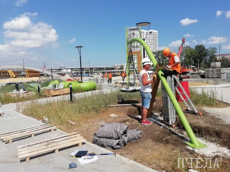 В Сквере искусств начали устанавливать качели, горки и другие малые формы