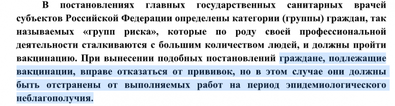 Минтруд и Роспотребнадзор накануне, 23 июля, опубликовали рекомендации для работодателей по поводу вакцинации персонала. В них указано, что в случае отказа сотрудников от вакцинации без медотвода их необходимо отстранить от работы без сохранения заработной платы.