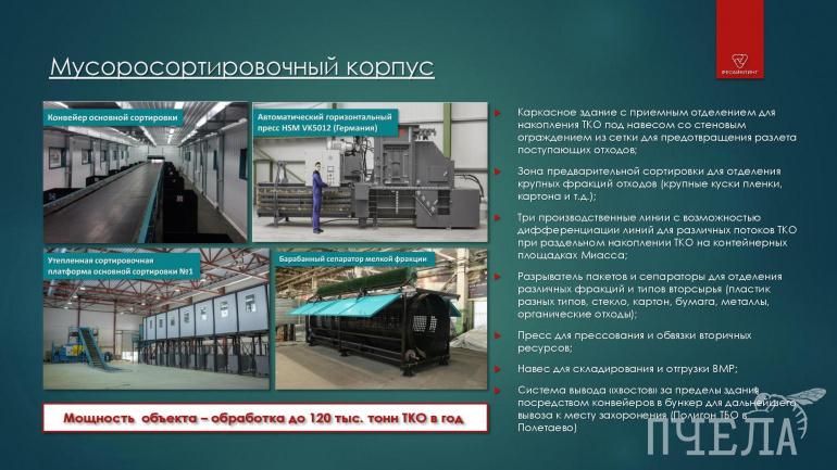 Мощность нового комплекса, который рассчитан на сортировку 110 тысяч тонн ТКО в год, покроет эти потребности. О технических параметрах предлагаемого к реализации проекта рассказал официальный представитель ООО «Ресайклинг» Валентин Коваленко. По его словам, на предприятии (кроме сортировки мусора) предлагается организовать производство по переработке вторичного сырья. Так, строительные отходы, спилы деревьев и отходы от коммерческой деятельности, которые на данный момент загрязняют природные территории и городские пространства в Миассе, смогут стать чем-то полезным. Мусор будут перерабатывать в новые материалы — технические грунты и удобрения. Также в планах — переработка пластика в дорожную плитку, а ПЭТ-тары — в синтетическое волокно для изготовления спецодежды. При этом отходы на предприятии будут храниться не более трёх дней. А так называемые «хвосты» — мусор после выборки из него годных к переработке компонентов, в соответствии с территориальной схемой будет направляться на захоронение на полигон ТБО в Полетаево.
