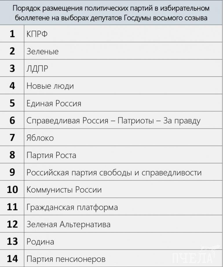 Избирательная комиссия провела жеребьёвку для предстоящих думских выборов. Специалисты определили порядок, в котором партии будут представлены в бюллетенях. Список публикуют телеграм-каналы.
