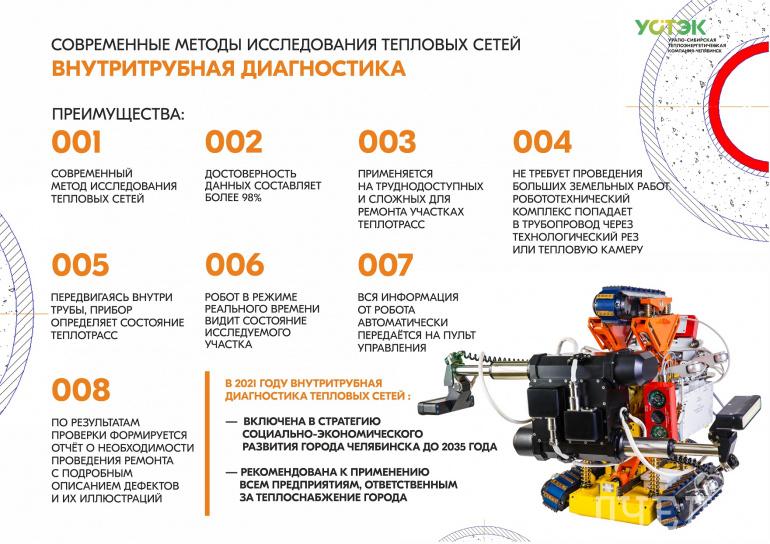 Принцип работы ВТД — робота погружают в трубопровод тепловой сети через технологический рез или теплокамеру. Передвигаясь внутри трубы, прибор методом визуально-измерительного и магнитного контроля определяет состояние трассы. По результатам проверки формируется отчёт и выдаётся заключение о необходимости проведения ремонта. Диаметр исследуемых труб — от 500 до 1110 мм. Скорость движения робота в трубе — 16 км/час. Длина исследуемого участка — до 300 метров. Приоритетные участки — магистральные тепловые сети, проложенные в наиболее труднодоступных для ремонта местах: под оживлёнными перекрёстками, автодорогами, виадуками, трамвайными путями. ИнвестицииАО «УСТЭК-Челябинск» в 2021 году — 1 млрд 228 млн рублей.