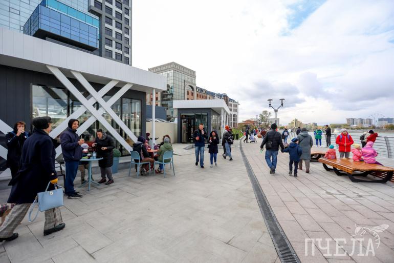 Набережная вымощена гранитом. Здесь появились малые архитектурные формы, газоны, освещение, торгово-выставочные павильоны и прокат спортинвентаря. По всему периметру площадки установили камеры — так у вандалов будет меньше соблазна разрушить что-либо.