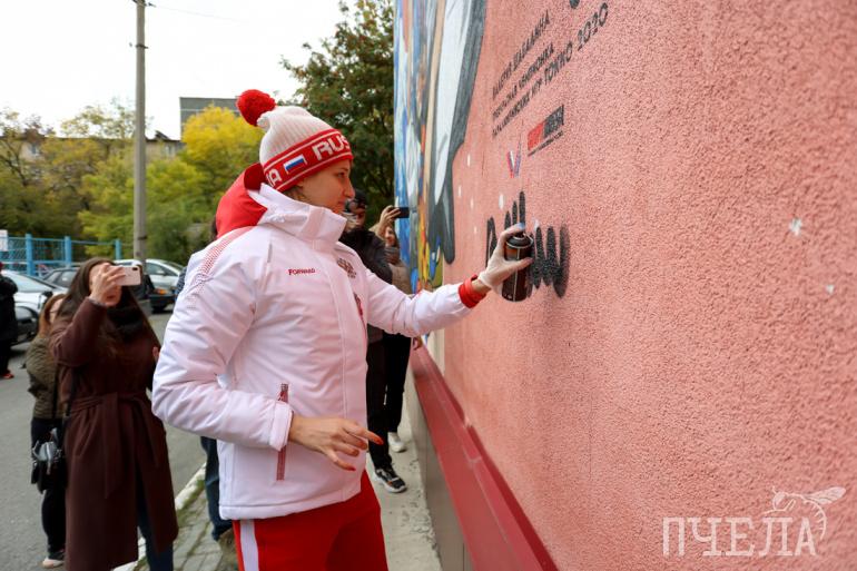 Посвятить спортсменке граффити предложили активисты Общероссийского народного фронта, они же оплатили работу. Наносила рисунок команда «Граффити Россия». Мурал рисовали с одного из снимков. Портрет дополнили изображением волны.