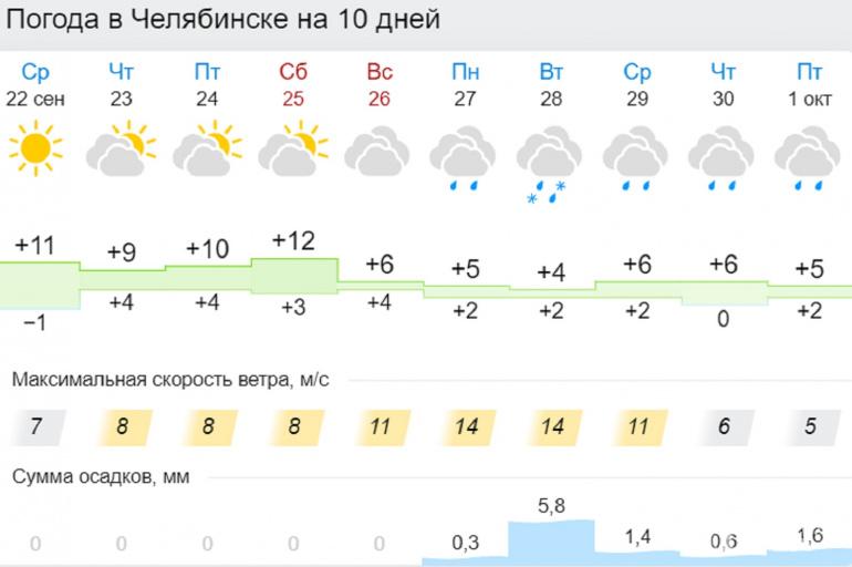 В Челябинске в ближайшие ночи будет от 0 до +2 градусов, днём — от +10 до +13. Северо-западный и северный ветер сегодня будет дуть со скоростью 4–9 метров в секунду, а потом он стихнет и станет неустойчивым. Долгосрочный прогноз Гисметео гласит, что на следующей неделе в город вернутся дожди, которые временами будет сопровождать мокрый снег.