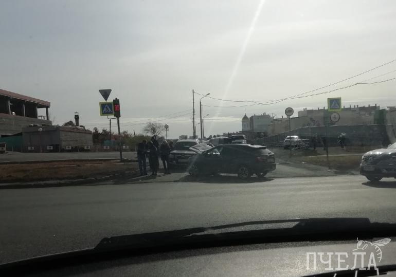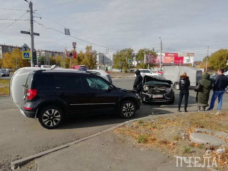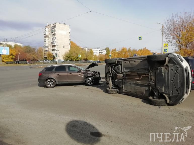 На перекрёстке улицы Молдавской и проспекта Победы на северо-западе Челябинска днём во вторник, 5 октября, столкнулись три автомобиля. Один из них при ударе опрокинулся на бок.