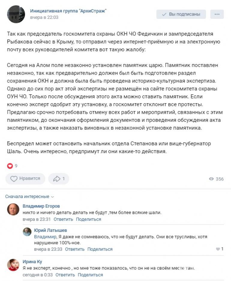 — Памятник поставлен незаконно, так как предварительно должен был быть подготовлен раздел сохранения ОКН (объекта культурного наследия — прим. автора) и должна была быть проведена историко-культурная экспертиза. Однако до сих пор акт этой экспертизы не размещён на сайте госкомитета. Только после обсуждения этого акта можно ставить памятник, если, конечно, эксперт одобрит эту установку, а госкомитет отклонит все протесты. Предлагаю срочно потребовать отмену всех работ и мероприятий, связанных с этим памятником, до окончания оформления документов и проведения обсуждения акта экспертизы, а также наказать виновных в незаконной установке памятника, — говорится в сообщении.