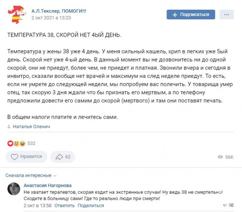 — Температура у жены 38 градусов уже четвёртый день. У меня сильный кашель, хрип в лёгких уже пятый день. Скорой нет уже четвёртый день. В данный момент вы не дозвонитесь ни до одной скорой, они не приедут, более того, не приедет и платная. Звонили вчера и сегодня в «Инвитро», сказали, что вообще нет врачей и максимум на следующей неделе приедут, — написали челябинцы в группе «ВКонтакте» «Текслер А.Л., помоги!» 4 октября.