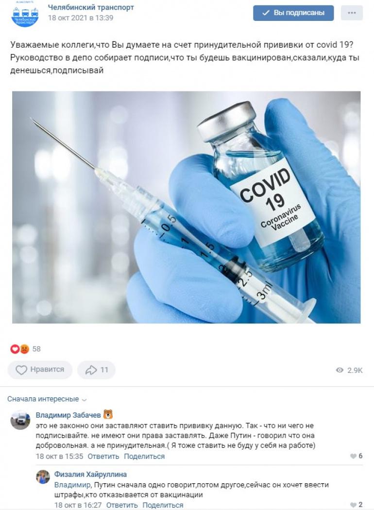 — Уважаемые коллеги, что Вы думаете насчёт принудительной прививки от COVID-19? Руководство в депо собирает подписи, что ты будешь вакцинирован, сказали: «Куда ты денешься, подписывай», — написал один из пользователей «ВКонтакте».